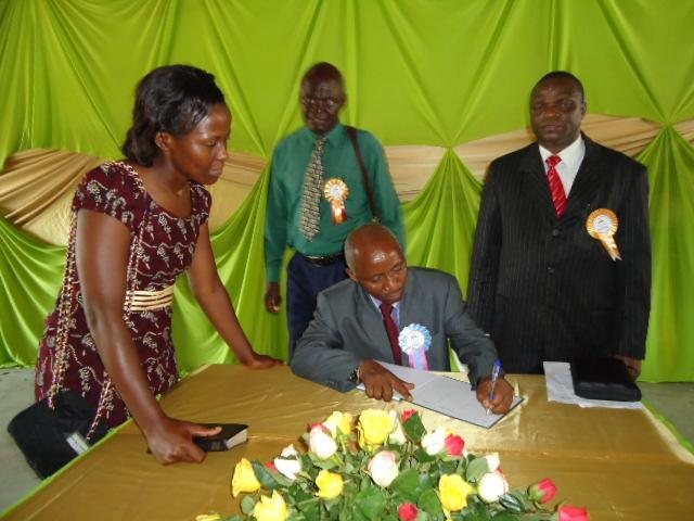 Left: Pr Japheth Katuku, the Officiating Minister during the opening signs the visitors book as the first visitor of the newly opened Sabbath School. Standing from right: Pr Daniel Yeri, the District Pastor, Evangelistic Ibrahim Omondi and Mrs Wilkister Bosire, the Women Ministries Leader. Right: Part of the congregation in the new Church.